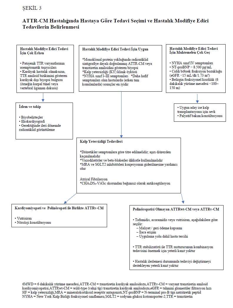 Etki mekanizmaları gereği, transtiretin stabilizatörleri olan tafamidis ve acoramidis ile transtiretin susturucusu vutrisiran hastalığın ilerlemesini yavaşlatır; ancak hedef organ hasarını geri döndürmez. Bu nedenle bu tedavilerin, fonksiyonel durumu ve yaşam kalitesini iyileştirmekten ziyade koruması beklenir. ATTR-CM için hastalık modifiye edici tedaviye başlamak için en uygun zaman, belirgin hedef organ disfonksiyonu gelişmeden önce semptomatik hastalığın en erken başlangıcıdır (Şekil 3).
