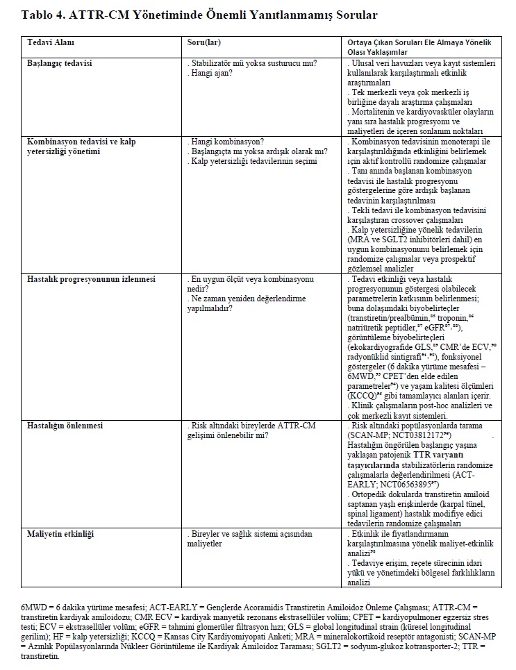 Son on yılda ATTR-CM’nin erken tanınması, doğru tanısı ve etkili tedavisindeki paralel ilerlemelerin önemli sonucu, amiloid tedavilerine yönelik dönüm noktası çalışmalarında giderek daha sağlıklı hasta popülasyonlarının yer almasıdır. Özellikle en güncel çalışma olan HELIOS-B’nin tedavi kolunda tüm nedenlere bağlı ölüm oranı, yaşa göre beklenen 3 yıllık mortalite oranına yaklaşmıştır.⁸⁴ Bununla birlikte bu önemli ilerlemelere rağmen birçok önemli soru hâlâ yanıtlanmamıştır (Tablo 4).⁶⁹ Günümüzde onaylanmış transtiretin hastalık-değiştirici tedaviler arasında iki transtiretin stabilizatörü (acoramidis ve tafamidis) ve bir transtiretin susturucu (vutrisiran) bulunmaktadır. Böylece klinisyenlerin artık ATTR-CM ile yaşayan bireylerde yaşam kalitesini korumak ve sağkalımı artırmak için birden fazla tedavi seçeneği vardır. Şu anda hiçbir çalışma bir ajanın diğerine üstün olduğunu göstermemiştir; ayrıca rutin kombinasyon tedavisini önermek veya hastalık progresyonunu azaltmak amacıyla tedaviyi değiştirmek için yeterli veri bulunmamaktadır. Bununla birlikte devam eden çalışmalar, bazı yanıtlanmamış soruların açıklığa kavuşmasına ve ATTR-CM’li bireyler için en uygun bakımın geliştirilmesine katkı sağlayabilir.