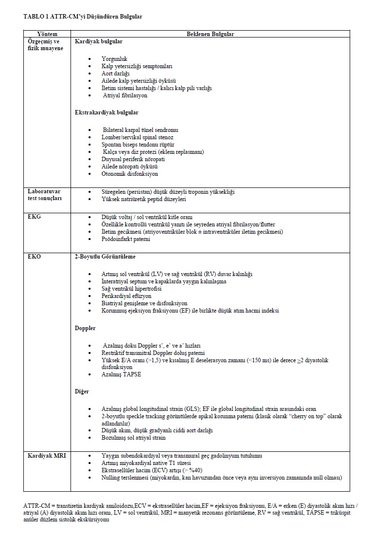 Elektrokardiyografi, ekokardiyografi ve kardiyak manyetik rezonans (CMR) görüntüleme tanıyı düşündürebilir (Tablo 1). AL amiloidozunun aksine, elektrokardiyogramda (EKG) düşük QRS voltajı ATTR-CM için duyarlı değildir ve olguların yalnızca %25–40’ında gözlenir. Daha doğru bir elektrokardiyografik parametre voltaj/kitle oranıdır²⁷˒²⁸. Ekokardiyografi, artmış sol ventrikül duvar kalınlığı ve sıklıkla apikal korunma paterni ile birlikte anormal global longitudinal strain (GLS) gösterir²⁹⁻³¹. CMR’de geç gadolinyum tutulumu ve ekstrasellüler hacim ölçümü tamamlayıcı bilgiler sağlar³²; Ancak ne ekokardiyografi ne de CMR, doku biyopsisi olmaksızın ATTR-CM tanısını kesin olarak koydurabilir ya da ATTR-CM’yi AL amiloidozundan güvenilir biçimde ayırt edebilir. Kardiyak biyobelirteçler, klinik şüphesi düşük olan bireylerde ATTR-CM’yi dışlamak için yardımcı araçlar olarak kullanılabilir; N-terminal pro–B-tipi natriüretik peptid (NT-proBNP) <180 ng/L ve yüksek duyarlılıklı troponin T (hs-TnT) <14 ng/L eşik değerleri ATTR-CM’yi dışlayabilir³³˒³⁴. Kardiyak ve nonkardiyak klinik ipuçlarının ATTR-CM için pretest olasılığına nasıl dönüştürüleceğine ilişkin kanıta dayalı yerleşik bir algoritma bulunmamakla birlikte; yaş, cinsiyet, hipertansiyon tanısı, relatif duvar kalınlığı, posterior duvar kalınlığı ve ejeksiyon fraksiyonunu içeren 6 değişkenli bir skor bildirilmiş olup, tarama aracı olarak yol gösterici olabilir³⁵. EKG³⁶, ekokardiyografi³⁷ ve kardiyak MR³⁸ için geliştirilen yapay zekâ ve makine öğrenimi temelli tarama algoritmaları, ATTR-CM tanısında ortaya çıkan yeni araçlardır. Ayrıca, tanısal algoritmanın başlatılmasını gerektiren yüksek getirili klinik ve görüntüleme ipuçlarının özeti Tablo 1’de sunulmaktadır.