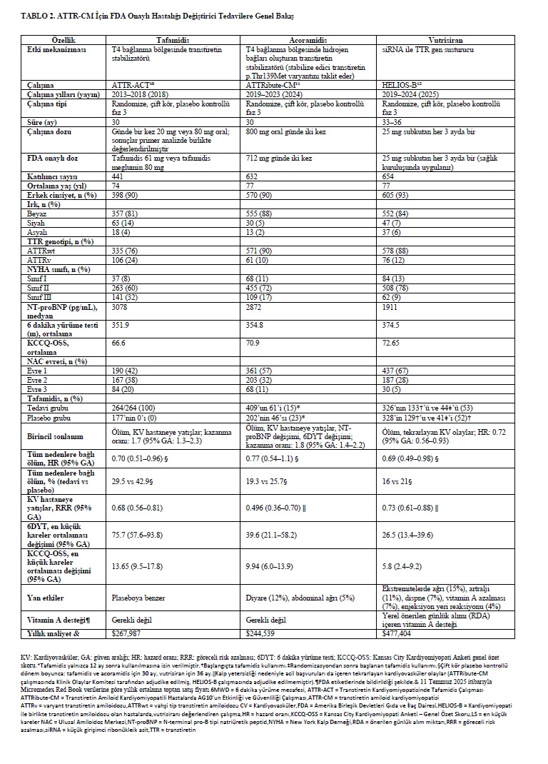 Etki mekanizmaları gereği, transtiretin stabilizatörleri olan tafamidis ve acoramidis ile transtiretin susturucusu vutrisiran hastalığın ilerlemesini yavaşlatır; ancak hedef organ hasarını geri döndürmez. Bu nedenle bu tedavilerin, fonksiyonel durumu ve yaşam kalitesini iyileştirmekten ziyade koruması beklenir. ATTR-CM için hastalık modifiye edici tedaviye başlamak için en uygun zaman, belirgin hedef organ disfonksiyonu gelişmeden önce semptomatik hastalığın en erken başlangıcıdır (Şekil 3).