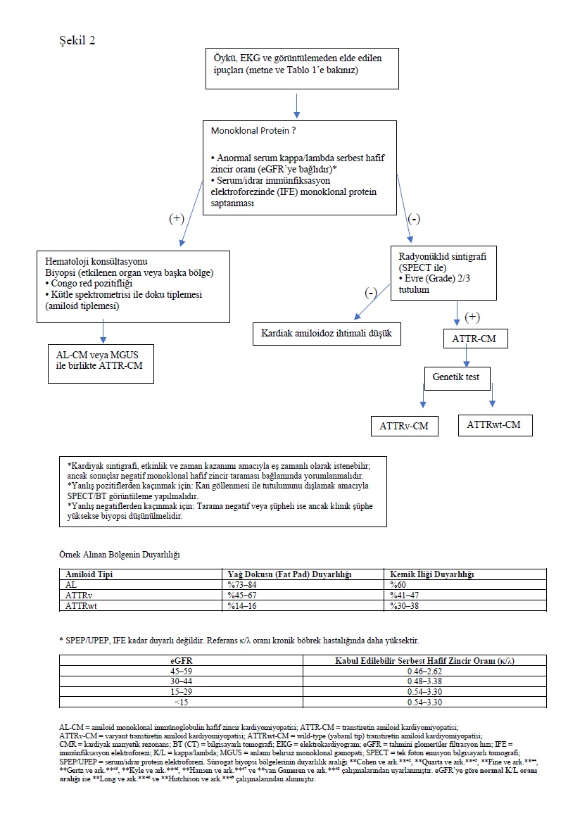 ATTR-CM’nin tanısal değerlendirmesindeki ilk ve en kritik adım, hafif zincir (AL) amiloidozunun dışlanmasıdır (Şekil 2). Bu amaçla serum serbest hafif zincir analizi ile birlikte serum ve idrar elektroforezi ve immünfiksasyon yapılır; bu üç testin kombinasyonu AL amiloidozunun saptanmasında %99 duyarlılığa sahiptir.39 Tanısal amaçla mutlak düzeylerden ziyade kappa ve lambda serbest hafif zincir oranı kullanılmalıdır. Özellikle, böbrek fonksiyon bozukluğu kappa hafif zincirlerinin renal klirensinin azalmasına bağlı olarak beklenenden daha yüksek kappa/lambda oranına yol açabileceğinden, bu oran böbrek fonksiyon bozukluğundan etkilenir. Bu gibi durumlarda serum ve idrar immünfiksasyon elektroforezi sonuçları genellikle normaldir ve AL amiloidozu nadirdir (Şekil 2).40 Ancak lambda serbest hafif zincir düzeylerinin artmasına bağlı olarak kappa/lambda oranının düşmesi durumunda ileri inceleme yapılmalıdır. Anormal monoklonal protein taramasının yorumlanması konusunda belirsizlik varsa, plazma hücre diskrazisinin varlığını doğrulamak amacıyla ileri tetkik gereksinimini belirlemek için bir hematoloji uzmanına danışılması yararlı olabilir.41 AL amiloidozu, negatif monoklonal protein taraması ile dışlandıktan sonra, noninvaziv tanı için radyonüklid sintigrafi kullanılabilir. Monoklonal protein yokluğunda Perugini evre 2 veya 3 miyokardiyal radyotracer tutulumu, ATTR-CM için %100 pozitif prediktif değere sahiptir.5 Ancak monoklonal protein taraması anormal olan her bireyde kesin tanı için doku biyopsisi ve kütle spektrometrisi ile amiloid tiplemesi yapılmalıdır.